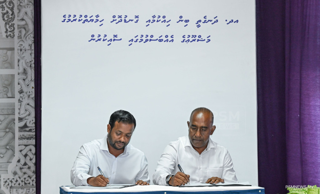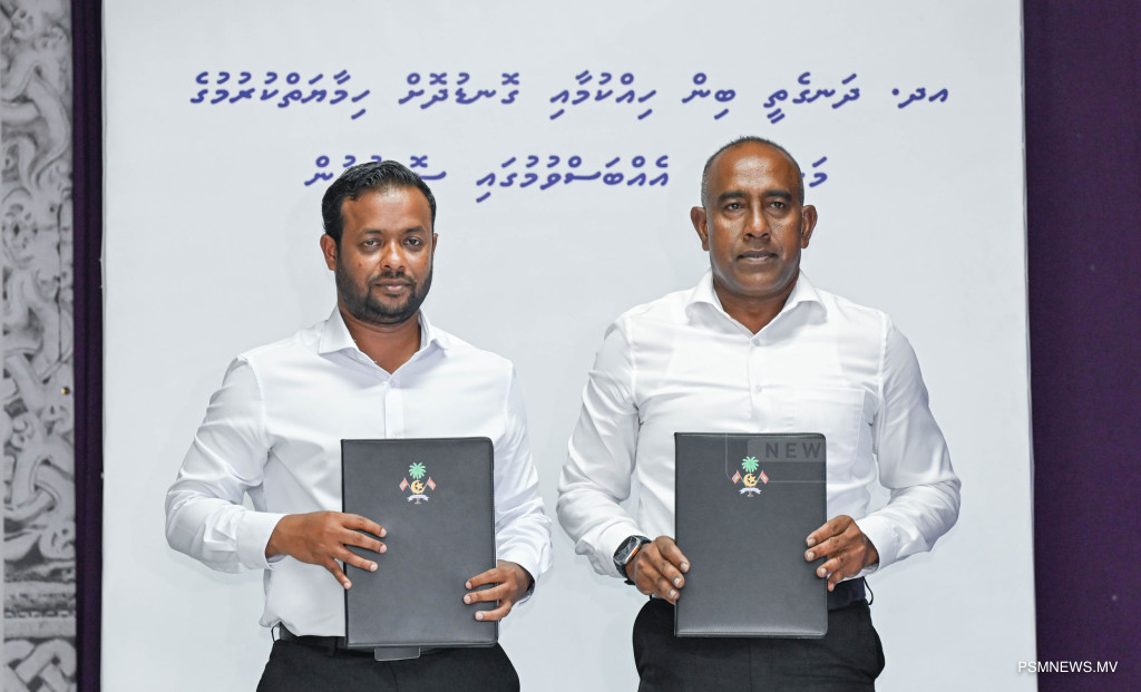 އދ. ދަނގެތީ ބިން ހިއްކުމާއި ގޮނޑުދޮށް ހިމާޔަތް ކުރުމުގެ މަޝްރޫޢުގެ އެއްބަސްވުމުގައި އިމާރާތްކުރުމާއި، ގެދޮރުވެރިކަމާއި ބިނާރާ ބެހޭ ވަޒީރު ޑރ.ޢަބްދުﷲ މުއްޠަލިބު އަދި އެމްޓީސީސީގެ މެނޭޖިން ޑިރެކްޓަރ އަހުމަދު ސައުދީ ސޮއިކުރައްވަނީ / ފޮޓޯ - ރައީސް އޮފީސް