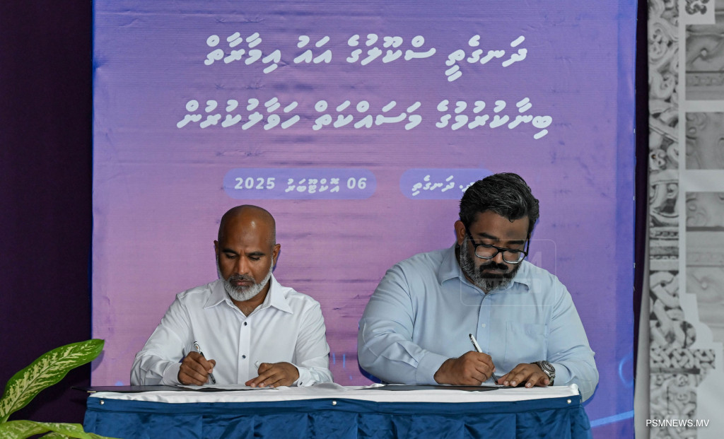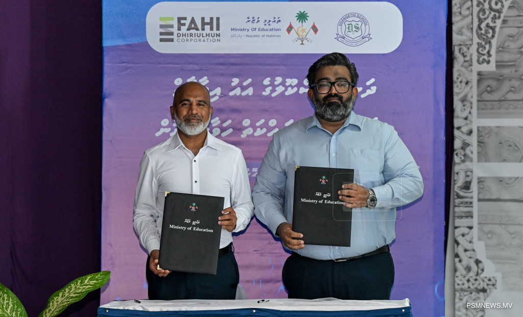 އދ. ދަނގެތީ ސްކޫލުގެ 10 ކުލާސް ރޫމާއި މަލްޓިޕާޕަސް ހޯލް އިމާރާތް ކުރުމުގެ އެއްބަސްވުމުގައި ތަޢުލީ ވަޒީރު ޑރ. އިސްމާއިލް ޝަފީއު އަދި ފަހި ދިރިއުޅުން ކޯޕަރޭޝަން ލިމިޓެޑުގެ މެނޭޖިންގ ޑިރެކްޓަރު، ހަމްދާން ޝަކީލް ސޮއިކުރައްވަނީ / ފޮޓޯ - ރައީސް އޮފީސް