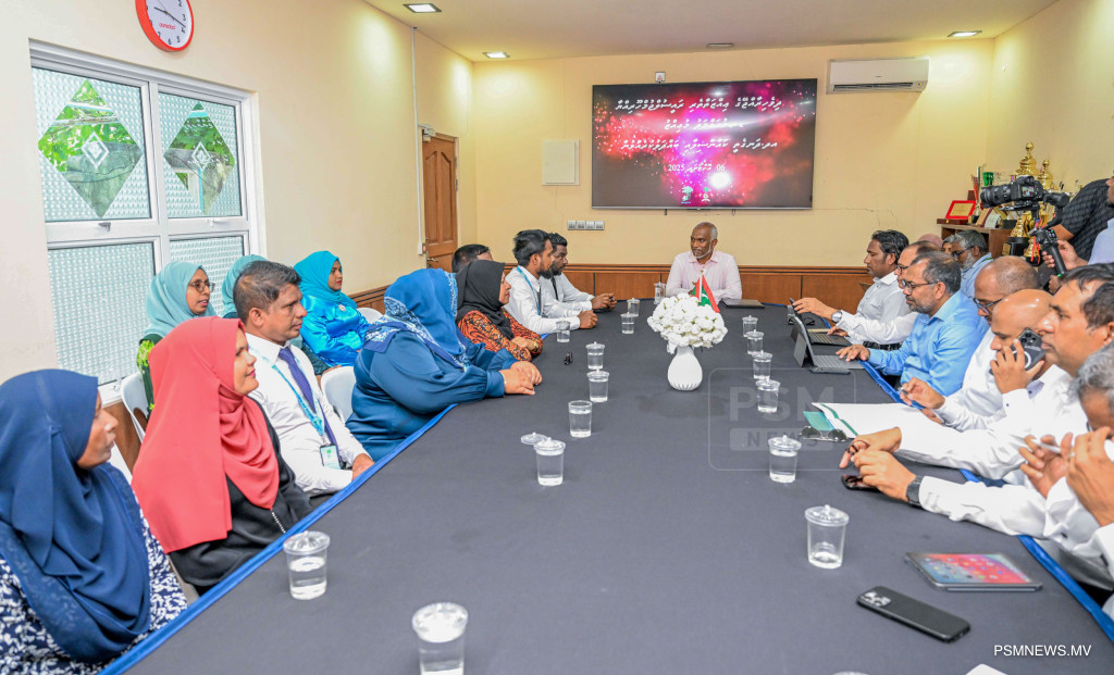 ރައީސުލްޖުމްހޫރިއްޔާ ޑރ. މުޙައްމަދު މުޢިއްޒު އދ. ދަނގެތި ކައުންސިލާއި، އ.ތ.މ ކޮމިޓީ އަދި ރަށުގެ މުއައްސަސާތަކުގެ އިސްވެރިންނާއި ބައްދަލުކުރެއްވުމުގެ ތެރެއިން / ފޮޓޯ - ރައީސް އޮފީސްސް
