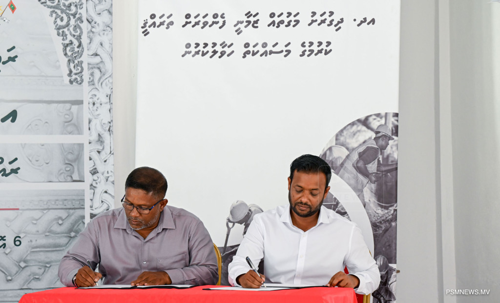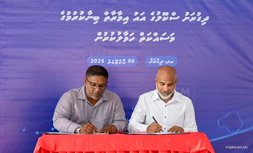 އދ. ދިގުރަށުގެ މަގުތައް ޒަމާނީ ފެންވަރަށް ތަރައްޤީކުރުމުގެ މަސައްކަތް ހަވާލުކުރުމުގެ އެއްބަސްވުމުގައި ބިނާރާބެހޭ ވަޒީރު ޑރ.ޢަބްދުﷲ މުއްތަލިބް އަދި އާރްޑީސީގެ މެނޭޖިން ޑިރެކްޓަރ އިބްރާޙިމް ނަޒީމު ސޮއިކުރައްވަނީ / ފޮޓޯ - ރައީސް އޮފީސް