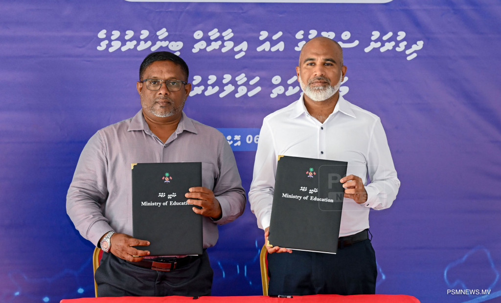 އދ. ދިގުރަށުގެ ސްކޫލްގެ އައު އިމާރާތުގެ ބިނާކުރުމުގެ މަސައްކަތް ހަވާލުކުރުމުގެ އެއްބަސްވުމުގައި ތަޢުލީމީ ވަޒީރު ޑރ.އިސްމާޢިލް ޝަފީޢު އަދި އާރްޑީސީގެ މެނޭޖިން ޑިރެކްޓަރ އިބްރާޙިމް ނަޒީމު ސޮއިކުރައްވަނީ / ފޮޓޯ - ރައީސް އޮފީސް