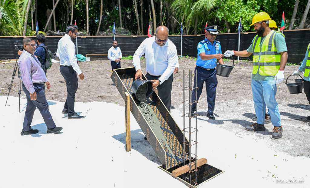 އދ. ދިގުރަށުގައި އަލަށް އިމާރާތްކުރާ ފުލުހުންގެ މަރުކަޒުގެ ބިންގާ ދާޚިލީ ސަލާމަތާއި ފަންނިއްޔާތާ ބެހޭ ވަޒީރު ޢަލީ އިޙްސާން އަޅުއްވައިދެއްވަނީ ފޮޓޯ - ރައީސް އޮފީސް
