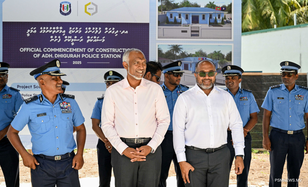 އދ. ދިގުރަށުގައި އަލަށް އިމާރާތްކުރާ ފުލުހުންގެ މަރުކަޒުގެ ބިންގާ އެޅުމުގެ ރަސްމިއްޔާތުގައި ރައީސުލްޖުމްހޫރިއްޔާ ޑރ. މުޙައްމަދު މުޢިއްޒު ބައިވެރިވެވަޑައިގަންނަވަނީ / ފޮޓޯ - ރައީސް އޮފީސް