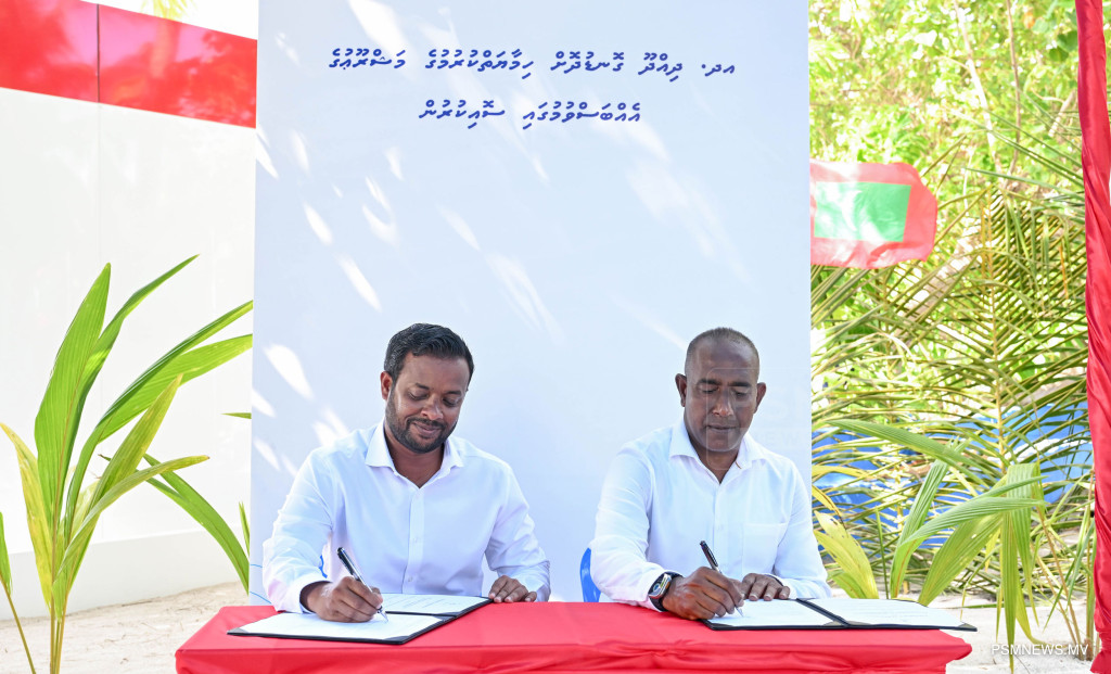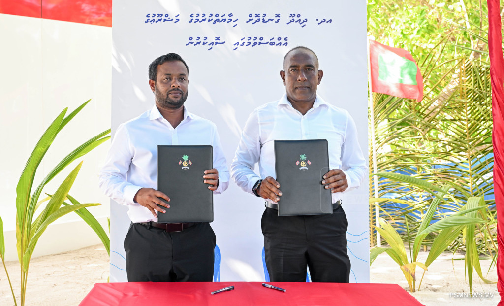 އދ. ދިއްދޫގެ ގޮނޑުދޮށް ހިމާޔަތްކުރުމުގެ މަޝްރޫއުގެ އެއްބަސްވުމުގައި އިމާރަތްކުރުމާއި ގެދޮރުވެރިކަމާ ބިނާރާ ބެހޭ ވަޒީރު ޑރ.ޢަބްދުﷲ މުއްޠަލިބު އަދި އެމްޓީސީސީގެ މެނޭޖިން ޑިރެކްޓަރ އަޙްމަދު ސަޢުދީ ސޮއިކުރައްވަނީ / ފޮޓޯ - ރައީސް އޮފީސް