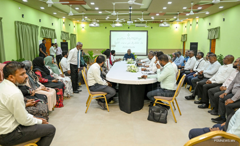 ރައީސުލްޖުމްހޫރިއްޔާ ޑރ. މުޙައްމަދު މުޢިއްޒު އދ. މާމިގިލި ކައުންސިލާއި، އ.ތ.މ ކޮމިޓީ އަދި ރަށުގެ މުއައްސަސާތަކުގެ އިސްވެރިންނާއި ބައްދަލުކުރެއްވުމުގެ ތެރެއިން / ފޮޓޯ - ރައީސް އޮފީސް