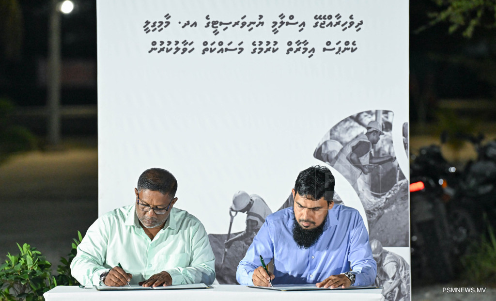 އދ. މާމިގިލީގައި ދިވެހިރާއްޖޭގެ އިސްލާމީ ޔުނިވަރސިޓީގެ ކެމްޕަހެއް ތަރައްޤީކުރުމަށް މަޝްރޫޢުގެ އެއްބަސްވުމުގައި އައިޔޫއެމްގެ ވައިސް ޗާންސެލަރ ޑރ. ޢަލީ ޒާހިރު އަދި ރޯޑް ޑިވެލޮޕްމަންޓް ކޯޕަރޭޝަންގެ މެނޭޖިން ޑިރެކްޓަރ އިބްރާހިމް ނަޡީމް ސޮއިކުރައްވަނީ / ފޮޓޯ - ރައީސް އޮފީސް