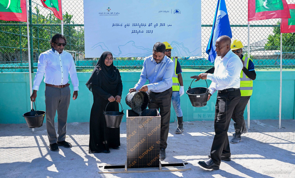 އދ. އޮމަދޫ ވޮލީ ކޯޓު ތަރައްޤީ ކުރުމުގެ އަމަލީ މަސައްކަތް ކުޅިވަރާއި ހަށިހެޔޮކަމާއި ބެހޭ ވަޒީރު އަބްދުﷲ ރާފިއު ފަށްޓަވައިދެއްވަނީ / ފޮޓޯ - ރައީސް އޮފީސް