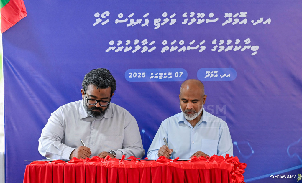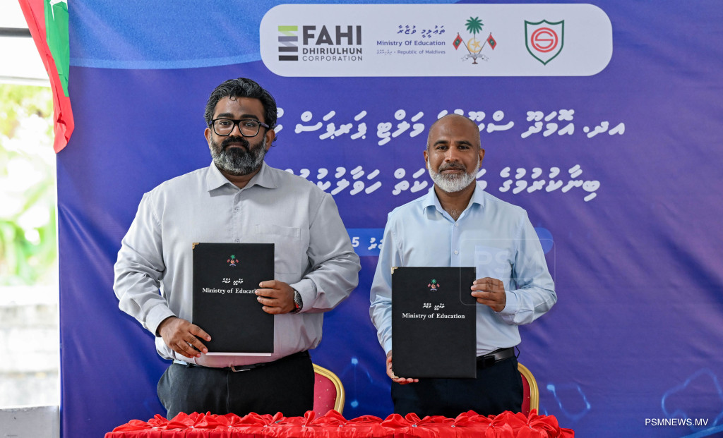 އދ. ކުނބުރުދޫ ސްކޫލްގެ މަލްޓި ޕަރޕަސް ހޯލް ބިނާކުރުމުގެ މަސައްކަތް ހަވާލުކުރުމުގެ އެއްބަސްވުމުގައި ތަޢުލީމީ ވަޒީރު ޑރ. އިސްމާޢިލް ޝަފީޢު އަދި ފަހި ދިރިއުޅުން ކޯޕަރޭޝަންގެ މެނޭޖިންގ ޑިރެކްޓަރ ޙަމްދާން ޝަކީލް ސޮއިކުރެއްވަނީ / ފޮޓޯ - ރައީސް އޮފީސް