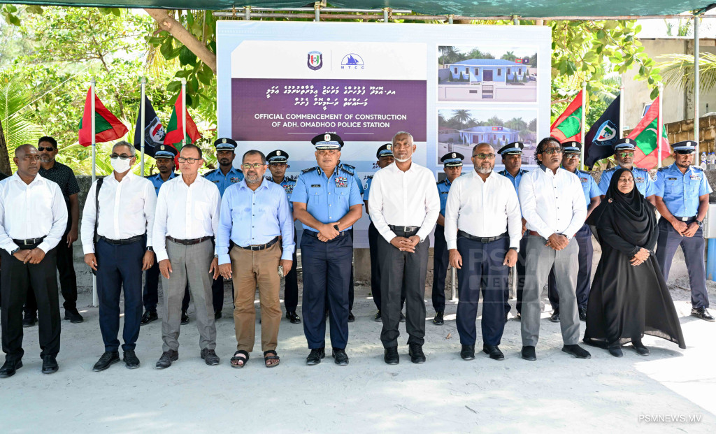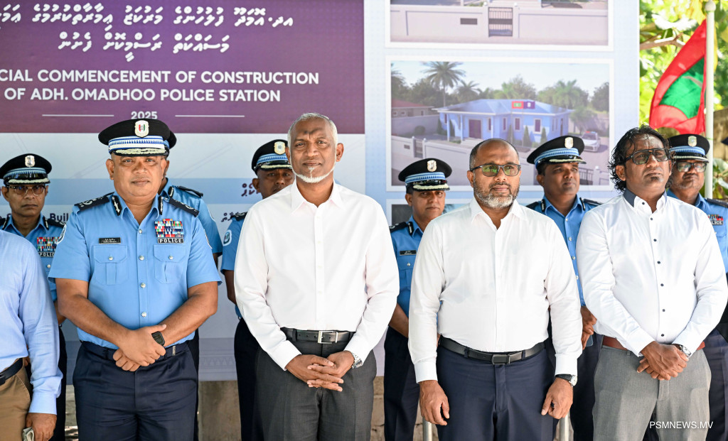 އދ. އޮމަދޫގައި ފުލުހުންގެ މަރުކަޒުގެ އައު އިމާރާތުގެ ބިންގާ އެޅުމުގެ ރަސްމިއްޔާތުގައި ރައީސުލްޖުމްހޫރިއްޔާ ޑރ. މުޙައްމަދު މުޢިއްޒު ބައިވެރިވެވަޑައިގަންނަވަނީ / ފޮޓޯ - ރައީސް