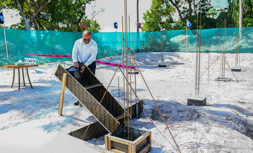 އދ. އޮމަދޫގައި ގާއިމު ކުރާ ފިޓްނެސް އެންޑް ރެކްރިއޭޝަން ސެންޓަރުގެ ބިންގާ އެޅުމުގެ ރަސްމިއްޔާތުގައި ރައީސުލްޖުމްހޫރިއްޔާ ޑރ. މުޙައްމަދު މުޢިއްޒު ބައިވެރިވެވަޑައިގަންނަވަނީ / ފޮޓޯ - ރައީސް އޮފީސް