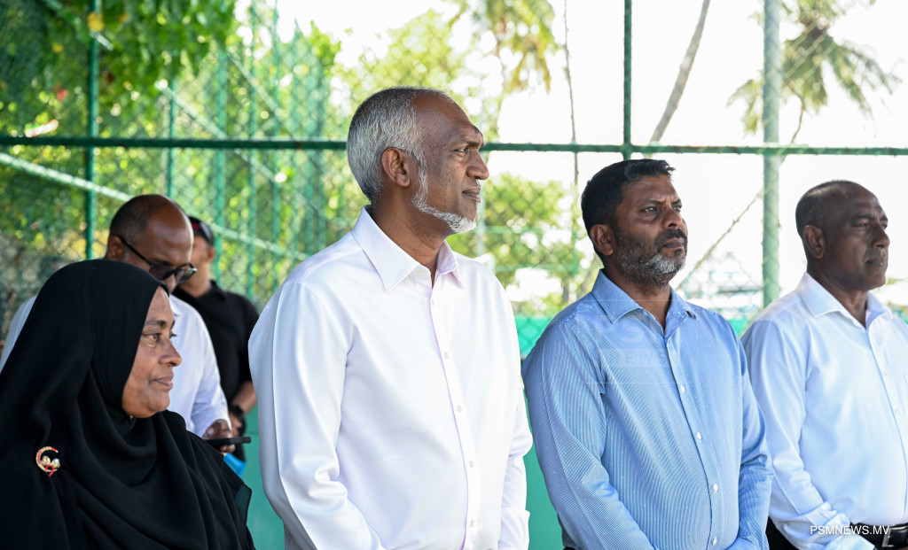 އދ. އޮމަދޫ ވޮލީ ކޯޓު ތަރައްޤީ ކުރުމުގެ އަމަލީ މަސައްކަތް ފެށުމުގެ ރަސްމިއްޔާތުގައި ރައީސުލްޖުމްހޫރިއްޔާ ޑރ. މުޙައްމަދު މުޢިއްޒު ބައިވެރިވެވަޑައިގަންނަވަނީ / ފޮޓޯ - ރައީސް އޮފީސް