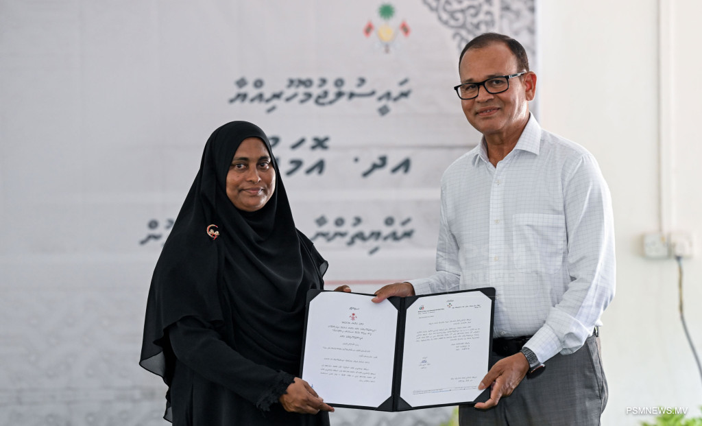 އދ. އޮމަދޫގައި ފަތުރުވެރިކަން ހިމެނޭގޮތުން އިޤްތިޞާދީ ގޮތުން ރައްޔިތުންނަށް މަންފާވާނެ ފަދަ ތަރައްޤީގެ މަސައްކަތްތައް ހިންގުމަށްޓަކައި އދ. އަތޮޅުގައި އޮންނަ ކުޑަދޫފަޅު ސިޓީތަކާއި އިދާރީ ދާއިރާތައް ހިންގުމާއި އާންމު މަސައްކަތްތަކާއި ބެހޭ ވަޒީރު އާދަމް ޝަރީފް އުމަރު ކައުންސިލާއި ހަވާލު ކުރައްވަނީ / ފޮޓޯ - ރައީސް އޮފީސް