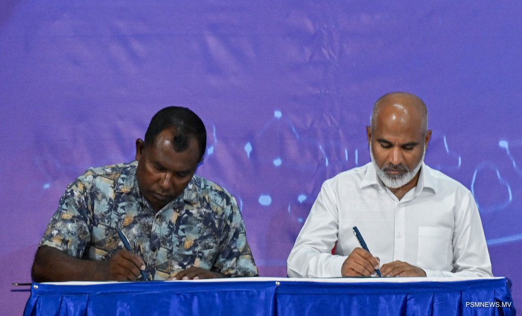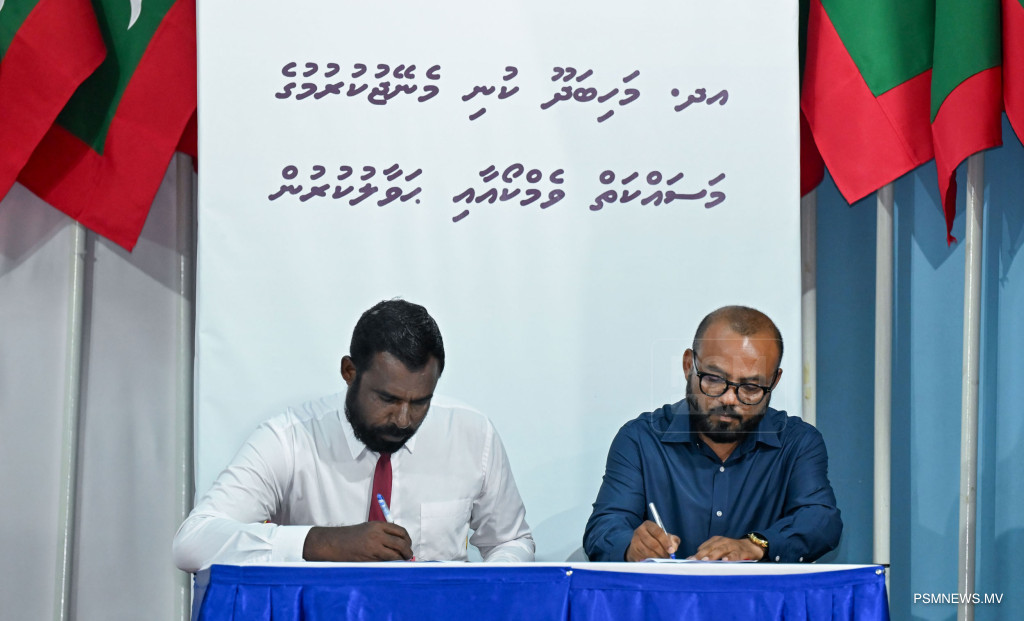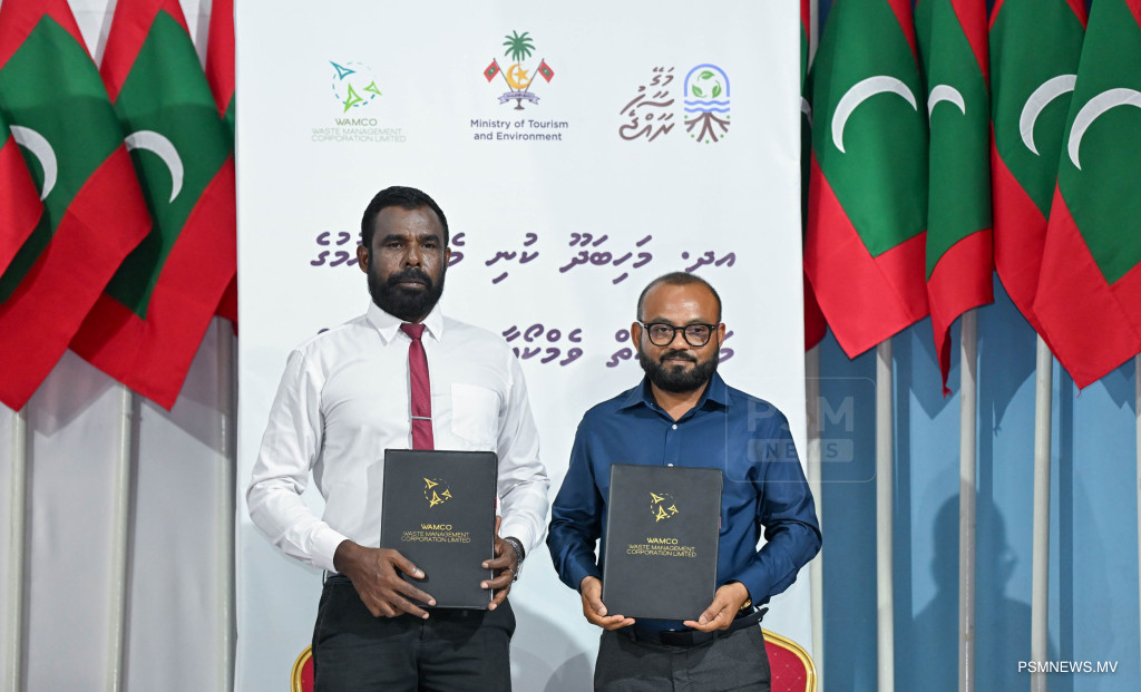 އދ. މަހިބަދޫގައި ވެމްކޯގެ ޚިދުމަތް ފެށުމަށް ވޭސްޓް މެނޭޖްމަނޓް ކޯޕަރޭޝަން ލިމިޓެޑްގެ މެނޭޖިން ޑިރެކްޓަރ މުޖްތަބާ ޖަލީލް އަދި ކައުންސިލްގެ ރައީސް ރަޝާދު އަލީއު ސޮއިކުރައްވަނީ / ފޮޓޯ - ރައީސް އޮފީސް